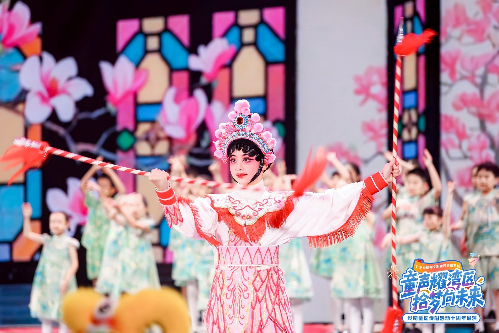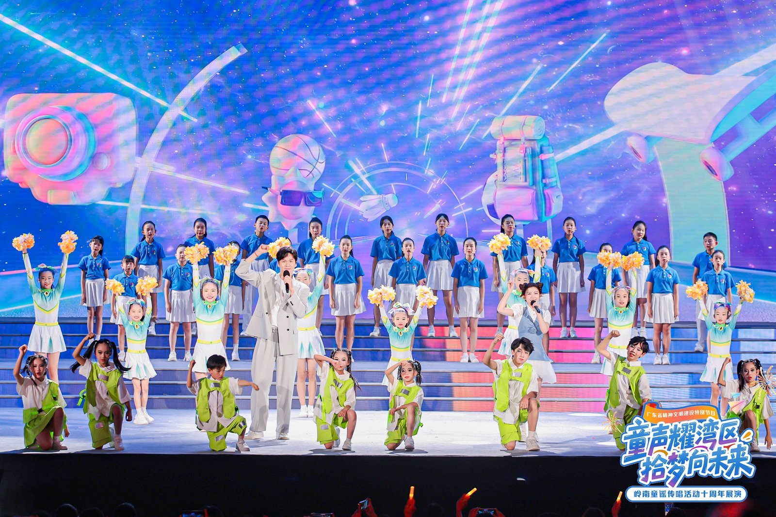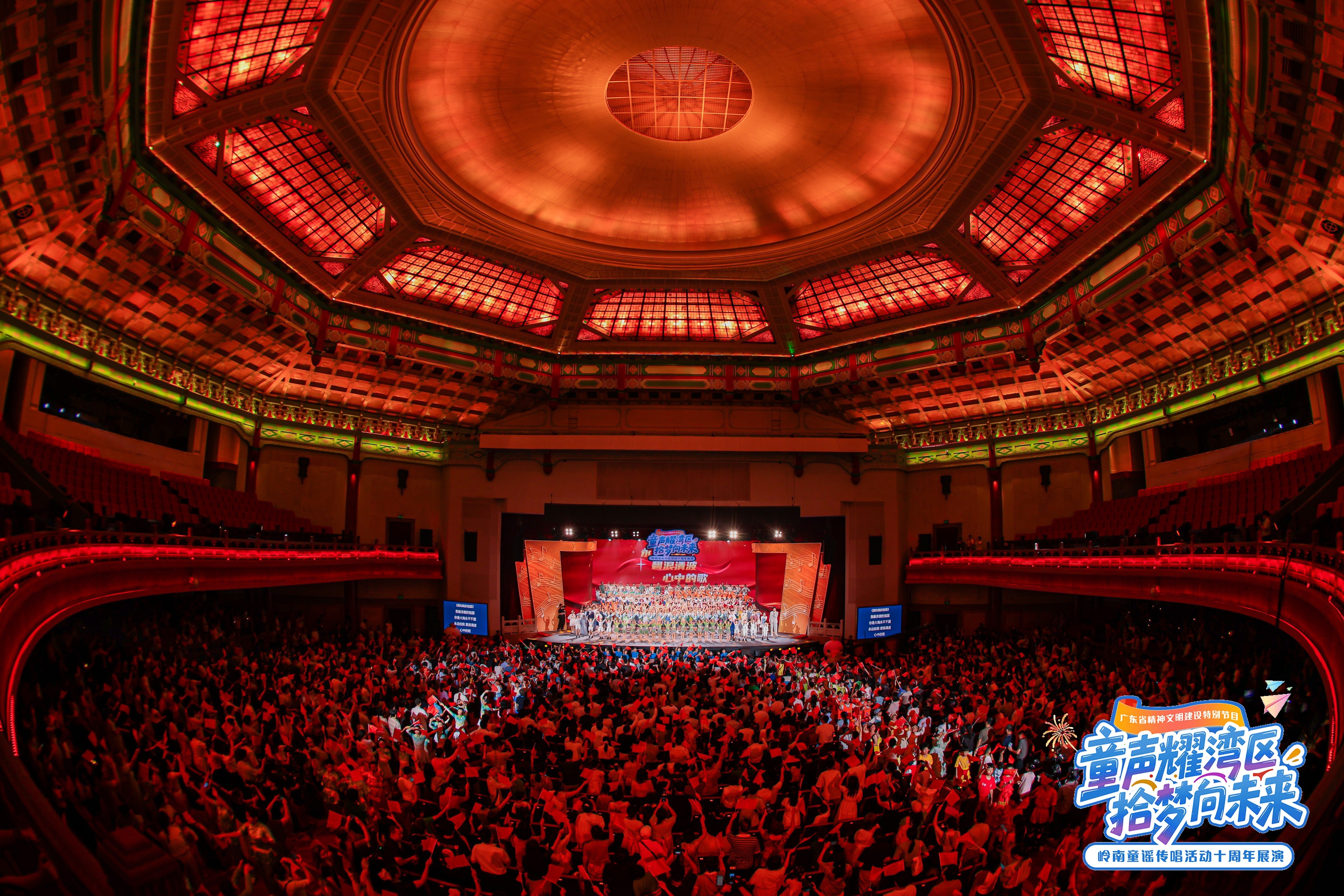 “满天木棉花,映红我块面,唱响南国声音,有我大湾区少年……”7月24日晚,广州中山纪念堂内,《南音颂湾区》的戏曲唱腔与童声合唱交织,拉开了广东省精神文明建设特别节目——“童声耀湾区 拾梦向未来”岭南童谣传唱活动十周年展演的序幕。粤港澳三地400余名少年儿童携手鲍春来、赖美云、曾小敏等演艺明星,以四大主题篇章、16个精品节目,呈现了一场融合非遗、科技与时代主题的童谣艺术盛宴。