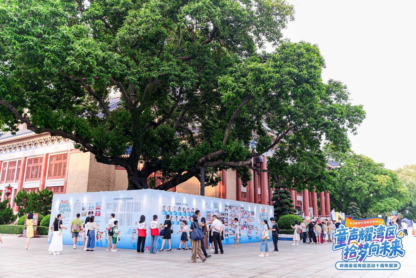 ▲中山纪念堂的左侧大榕树下,两块长约20米的展板,用图文并茂的方式直观展现出岭南童谣十周年所取得的丰硕成果;15位童谣名家的“创作者说”,传递出岭南童谣创作背后的初心与理念;加上三名来自广州市越秀区豪贤路小学的小讲解员的生动解说,吸引了不少游客驻足观看。